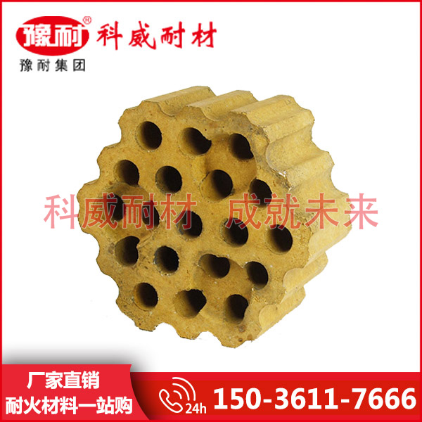 现代高炉采用蓄热式热风炉,热风炉是一组格子砖堆砌起来的庞大的高炉鼓风加热设施。 河南格子砖作为高温热量的载体,其工作原理是先燃烧煤气,用产生的高温烟气加热蓄热室的格子砖,再将冷风通过炽热的格子砖而被加热。将热风炉轮流交替地进行燃烧和送风,使高炉连续地获得高温热风。因此提高热风炉传热效率对提高风温有着重要意义。